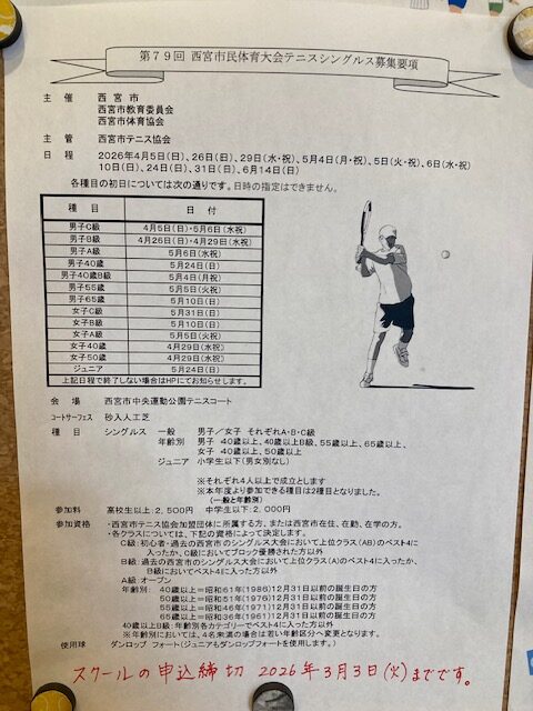 西宮市市シングルス申込受付(3月3日まで)